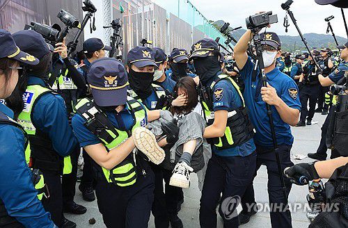 (서울=연합뉴스) 최재구 기자 = 11일 서울 광화문광장에서 경찰이 '트럼프 방한 반대, 약탈적 투자 강요 규탄' 등을 주장하며 연좌시위를 벌이던 한국대학생진보연합 회원들을 해산 및 이동조치 하고 있다. 2025.10.11