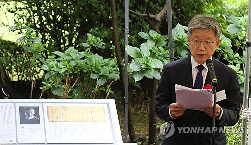 (도쿄=연합뉴스) 박상현 특파원 = 일본 도쿄 릿쿄대에서 11일 열린 시인 윤동주 기념비 제막식에서 윤동주 조카인 윤인석 성균관대 명예교수가 유족을 대표해 인사말을 하고 있다. 윤동주는 1942년 릿쿄대에서 공부했고, 이후 교토 도시샤대에 편입했다. 2025.10.11