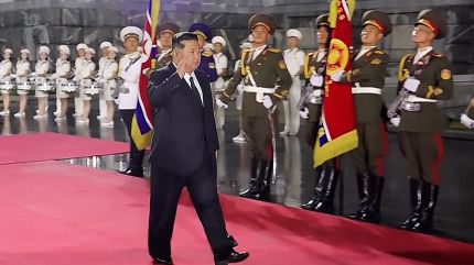 김정은 총비서가 리창 중국 총리, 또 럼 베트남 공산당 서기장, 메드베데프 러시아 국가안보회의 부의장과 함께 열병식장에 입장했습니다.