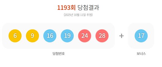 로또복권 운영사 동행복권은 제1193회 로또복권 추첨에서‘6, 9, 16, 19, 24, 28’이 1등 당첨번호로 뽑혔다고 11일 밝혔다. 보너스 번호는‘17’이다.