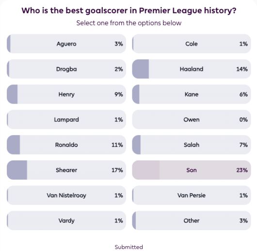그리고 결과는 놀라웠다. 11일 오후 2시 기준, 손흥민은 23%의 득표율로 단독 1위를 달리고 있다. 17%를 기록 중인 시어러, 14%의 홀란을 제치고 3일 연속 선두를 지켰다. 영국 언론들은 “손흥민이 PL의 판도를 바꾼 아시아 슈퍼스타임을 다시 증명했다”고 보도했다.