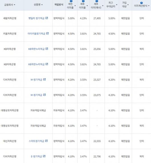 대명상호저축은행 자유적립식예금과 대신저축은행 스마트정기적금은 연 4.10%의 금리를 지원한다. 스마트정기적금은 매월 일정금액을 정기적으로 납입하고 만기일에 원리금을 지급받는 상품으로 복잡한 우대금리 조건이 없는 스마트폰 전용 적립식 적금상품이다. 가입기간은 12, 18, 24, 30, 36개월이며 가입금액은 1만원 부터다. 세후이자는 2만2000원이다.