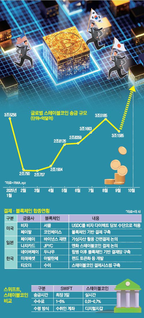미국에선 비자가 지난달 30일 자사의 실시간 개인 간(P2P) 송금서비스 '비자 다이렉트'에 스테이블코인 서클(USDC)을 결제 수단으로 시험 적용한다고 밝혔다. 비자 다이렉트는 기존 스위프트망 대신 자체 신용카드 결제망을 활용해 해외 송금을 처리하는 서비스다. 복잡한 중개 절차와 높은 수수료, 며칠씩 걸리는 시간 등 스위프트망의 고질적인 단점을 정면으로 겨냥한 것이다. 기업들이 법정화폐 예치 대신 스테이블코인으로 선납하면 비자는 이를 현금과 동등하게 취급해 즉시 송금·정산에 활용할 수 있게 한다는 구조다. 이 구조 아래 기업들은 법정화폐 대신 USDC를 비자에 지불하고 수취인은 현지 법정화폐로 돈을 받을 수 있게 됐다.