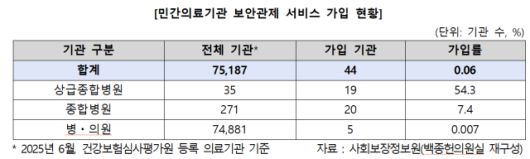 국회 보건복지위원회 백종헌 의원이 한국사회보장정보원 자료를 분석한 결과, 보안관제 서비스에 가입한 민간의료기관은 전체 7만5187곳 가운데 44곳, 가입률 0.06퍼센트에 불과했다.