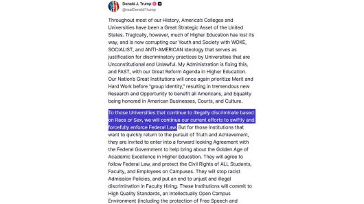 트럼프 대통령은 '워크' 같은 이념은 "대학들이 헌법과 법률에 위배되는 차별적 관행을 정당화하는 도구가 되고 있다"고 비판했습니다.