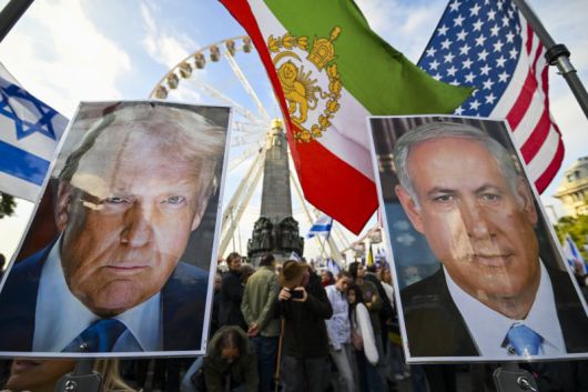12일(현지시간) 벨기에 브뤼셀에서 미국 도널드 트럼프 대통령(왼쪽)과 베냐민 네타냐후 이스라엘 총리의 사진을 든 시민들이 팔레스타인 평화구상 1단계 합의를 축하하는 행진을 하고 있다.EPA연합뉴스 |