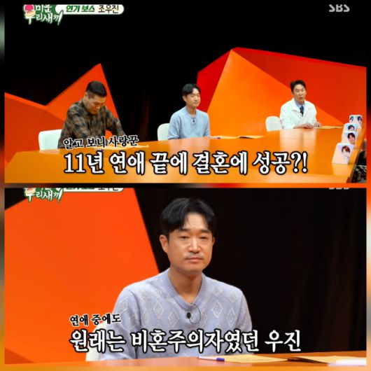 이날 MC 신동엽은 “조우진 씨가 11년 연애 끝에 결혼을 했다. 그런데 연애 시절엔 결혼 생각이 전혀 없었다고 하더라. 아내분이 서운해하지 않으셨냐”고 질문을 던졌다.