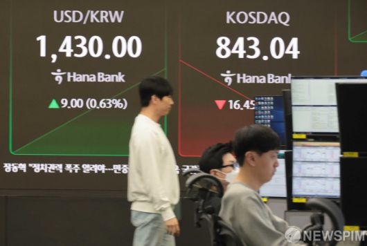 [서울=뉴스핌] 이길동 기자 = 13일 오전 서울 중구 하나은행 딜링룸에 코스피-코스닥 지수 및 달러/원 환율이 표시되어 있다. 이날 코스피는 전 거래일보다 60.52p(1.68%) 내린 3550.08에 코스닥 지수는 전 거래일보다 13.73p(1.60%) 내린 845.76에 거래를 시작했다. 서울 외환시장에서 달러/원 환율은 전장보다 9.0원 오른 1430.0원에 개장했다.2025.10.13 gdlee@newspim.com