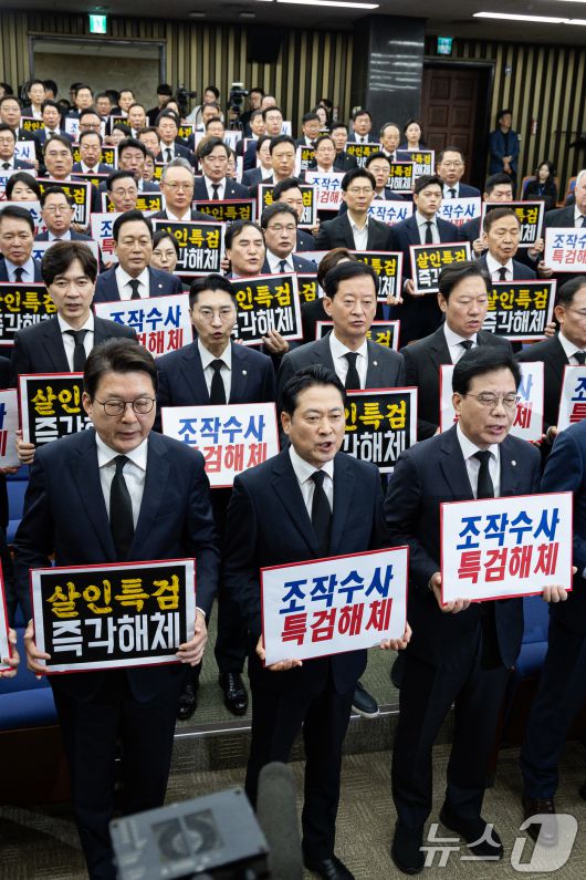 (서울=뉴스1) 유승관 기자 = 장동혁 국민의힘 대표와 송언석 원내대표를 비롯한 의원들이 13일 서울 여의도 국회에서 열린 긴급 의원총회에서 민중기 특검을 규탄하는 손팻말을 들고 구호를 외치고 있다. 2025.10.13/뉴스1fotogyoo@news1.krCopyright ⓒ 뉴스1. All rights reserved. 무단 전재 및 재배포, AI학습 이용 금지.