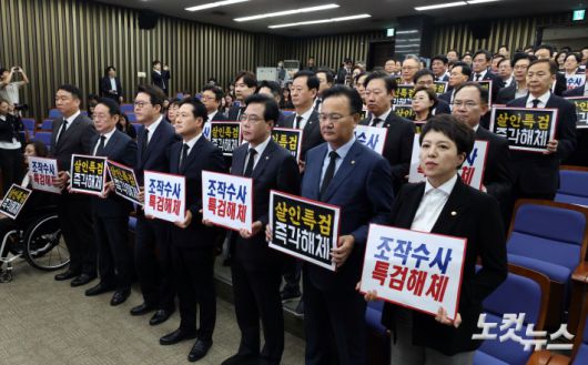 국민의힘 장동혁 대표와 송언석 원내대표 등 의원들이 13일 오전 국회에서 열린 긴급 의원총회에 참석해 민중기 특검 규탄 구호를 외치고 있다.저작권자 © CBS 노컷뉴스 무단전재 및 재배포 금지