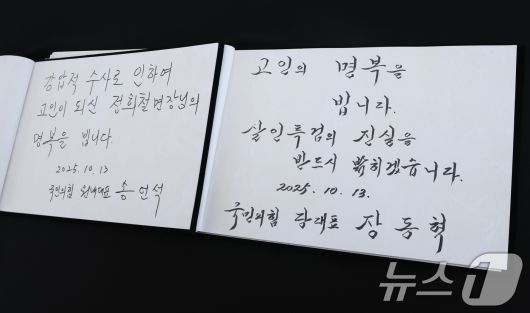 (서울=뉴스1) 안은나 기자 = 장동혁 국민의힘 대표, 송언석 원내대표가 13일 서울 여의도 국회에서 의원총회를 마친 뒤 김건희 특검 조사를 받던 중 숨진 양평군청 공무원 분향소를 찾아 남긴 조문록. 2025.10.13/뉴스1coinlocker@news1.krCopyright ⓒ 뉴스1. All rights reserved. 무단 전재 및 재배포, AI학습 이용 금지.