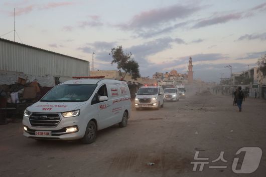 중재 역할을 맡은 국제적십자위원회(ICRC)가 13일(현지시간) 가자지구 남부 칸유니스에서 하마스가 석방하는 이스라엘 인질을 이동시키기 위해 동부로 향하고 있다. 2025.10.13 ⓒ AFP=뉴스1 ⓒ News1 김경민 기자 |