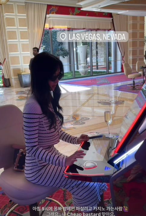 하원미는 지난 12일 자신의 인스타그램 스토리에 "아침 9시에 공짜 샴페인 마시려고 카지노 가는 사람. 그래요 나 cheap bastard 맞아요"이라는 문구와 함께 한 장의 사진을 업로드했다.