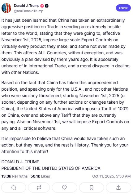 트럼프는 지난 10일(현지시간) 자신의 사회관계망서비스(SNS)를 통해 중국의 희토류 통제 조치를 겨냥해 "11월부터 중국에 현재 부과하고 있는 관세에 더해 100%의 추가 관세를 부과하고, 모든 핵심 소프트웨어에 대해 수출 통제를 시행할 것"이라며 반격에 나섰다.