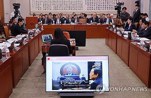 (서울=연합뉴스) 류영석 기자 = 13일 서울 여의도 국회에서 열린 대법원 등에 대한 법제사법위원회 국정감사에서 국민의힘 곽규택 의원의 질의 중 이재명 대통령이 대선 후보 당시 출연했던 유튜브 '김어준의 겸손은 힘들다 뉴스공장' 인터뷰가 재생되고 있다. 2025.10.13