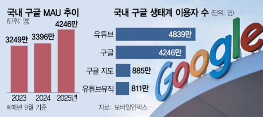 13일 모바일인덱스에 따르면 지난 달 기준 국내 구글 애플리케이션의 월간활성이용자(MAU)는 4246만 명으로, 집계 이래 역대 최고치를 기록했다. 구글 이용자 수는 매년 꾸준히 늘어나는 추세다. 지난 2023년 9월 3249만 명에 불과했던 구글 MAU는 지난해 같은 기간 3396만 명으로 늘어난 뒤 올해는 4300만 명대 돌파를 앞두고 있다. 단순 이용자 수 뿐만 아니라 지난 달 기준 국내 이용자들의 총 사용 시간(1955만 시간), 활성 기기 수(4900만 대), 신규 설치 건수(5905건) 등도 사상 최고치에 도달했다.