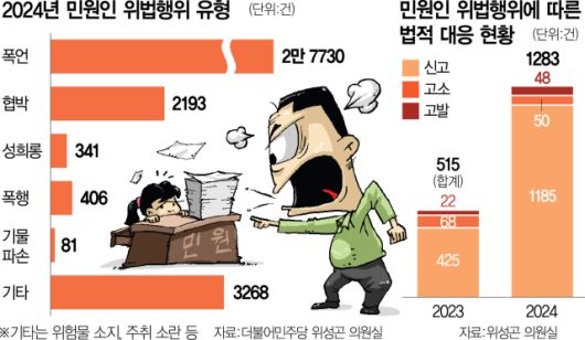 13일 국회 행정안전위원회 소속 위성곤 더불어민주당 의원실에 따르면 지난해 정부 부처, 지방자치단체, 공공기관 등에서 일어난 민원인의 위법행위는 3만 4019건으로 집계됐다. 공휴일을 뺀 근무 일수(약 250일)를 감안하면 하루 평균 140건이 일어난 셈이다. 구체적인 사례를 보면 폭언이 2만 7730건에 달했으며 민원인에게 협박을 당한 사례도 2193건이나 있었다.