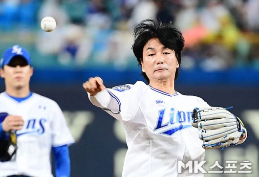 경기에 앞서 배우 이철민이 시구를 하고 있다.