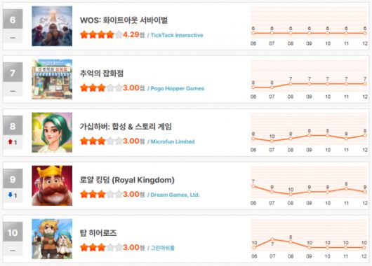 그 외 ‘가십하버: 합성 & 스토리 게임’은 8위로 소폭 하락했으며, ‘로얄 킹덤’은 9위로 내려앉았다. ‘탑 히어로즈’는 꾸준한 업데이트와 유저 복귀 효과로 TOP10을 유지하며 뒷심을 발휘했다.