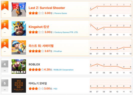 ‘로블록스’는 긴 추석 연휴의 수혜를 가장 크게 본 게임이다. 가족 단위 플레이와 친구 초대 유저가 폭증하면서, 다시 4위까지 상승했다. ‘마비노기 모바일’ 역시 꾸준한 이벤트와 커뮤니티 활동을 기반으로 5위권에 재진입하며 저력을 과시했다. 반면, 한때 상승세를 탔던 ‘WOS: 화이트아웃 서바이벌’은 6위에 고정되며 잠시 숨을 고르는 모양새다.