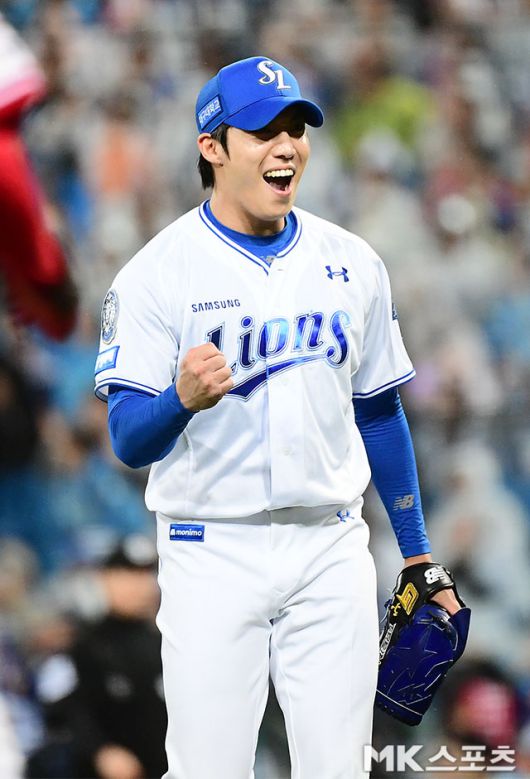 5회초 2사 2루에서 삼성 선발 원태인이 SSG 에레디아를 중견수 뜬공처리한 후 환호하고 있다.