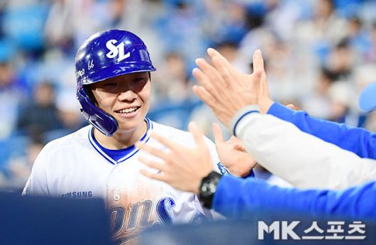 5회말 1사 2루에서 삼성 김성윤의 2루타때 득점을 올린 2루주자 김지찬이 더그아웃 동료들과 하이파이브를 하고 있다.