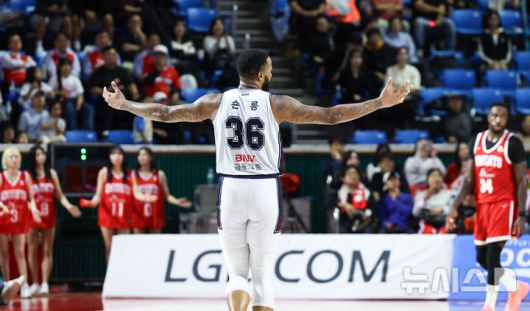 [서울=뉴시스] 최진석 기자 = 13일 서울 송파구 잠실학생체육관에서 열린 2025-2026 KBL 프로농구 서울 SK 나이츠와 부산 KCC 이지스의 경기. KCC 숀 롱이 득점 후 기뻐하고 있다. 2025.10.13. myjs@newsis.com