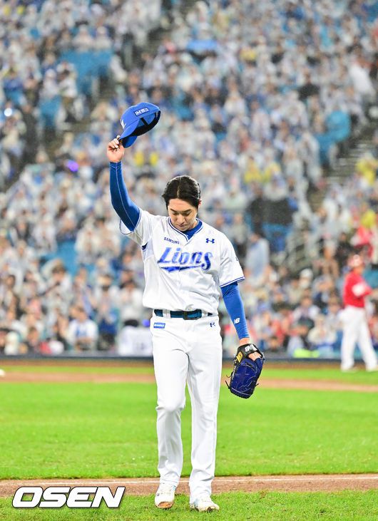 [OSEN=대구, 박준형 기자] 13일 대구 삼성라이온즈파크에서 ‘2025 신한 SOL뱅크 KBO리그’ 준플레이오프(5전 3선승제) 3차전 삼성 라이온즈와 SSG 랜더스의 경기가 열렸다 삼성은 원태인, 방문팀 SSG은 드류 앤더슨을 선발로 내세웠다. 7회초 교체된 삼성 선발투수 원태인이 팬들에게 인사하며 마운드를 내려가고 있다 2025.10.13 / soul1014@osen.co.kr