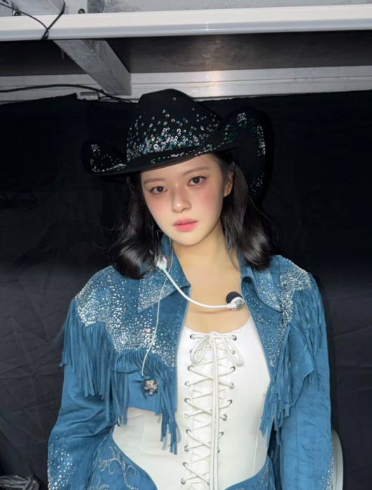 반짝이는 스톤 장식의 블랙 카우보이 햇을 더한 스타일링은 서부극 속 한 장면을 연상시키며, 정연 특유의 도회적인 분위기와 어우러져 강렬한 무드를 완성했다.