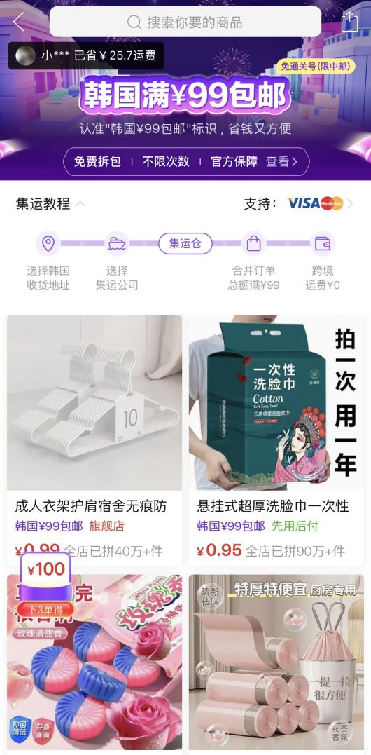 14일 업계에 따르면 핀둬둬는 최근 자사 앱에서 한국으로의 배송 서비스를 선보였다. 99위안(약 2만원) 이상 배너가 붙어있는 상품을 기준으로 무료배송도 해준다. 구매 과정에서 주소 입력과 결제 등 한국어 서비스도 일부 지원한다. 알리페이나 위챗페이 등 현지 결제 수단 외에 일반 카드 결제도 가능하다.