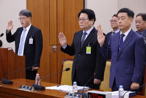 반상권 방송미디어통신위원회 위원장 직무대리를 비롯한 대상 기관 증인들이 14일 국회 과학기술정보방송통신위원회에서 열린 2025년도 국정감사에서 선서하고 있다.(사진=연합뉴스) |