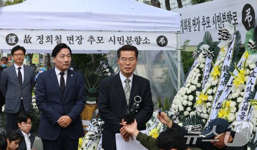 양평고속도로 특혜 의혹으로 김건희 특검 수사를 받다가 숨진 경기 양평군 공무원 측 박경호 변호사가 14일 오전 서울 종로구 김건희 특검 사무실 앞에 마련된 분향소에서 기자회견을 하고 있다. 2025.10.14/뉴스1 ⓒ News1 황기선 기자 |