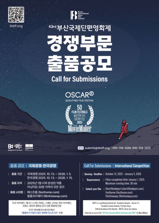 제43회 부산국제단편영화제 경쟁 부문의 출품 기간은 지난 13일을 시작으로 국제경쟁은 내년 1월 5일까지, 한국경쟁은 같은해 1월 15일까지다. 출품 자격은 올해 1월 이후에 완성된 러닝타임 30분 이하 모든 장르의 단편영화를 대상으로 하며, 접수 및 출품료 결제는 온라인 출품 사이트를 통해 진행된다.