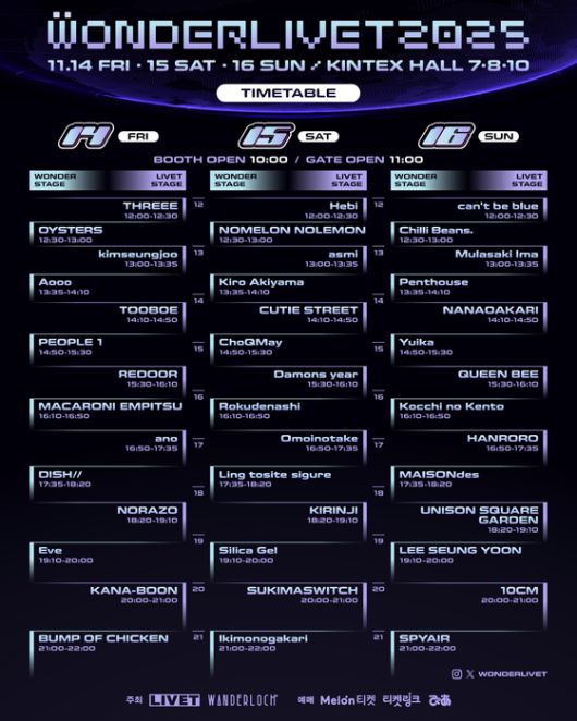 지난 13일 공개된 '원더리벳 2025' 타임테이블을 통해 3일간 펼쳐질 42팀, 총 2개의 스테이지 공연 순서가 확정되며, 관객들은 직접 자신만의 관람 루트를 구체화할 수 있게 됐다.