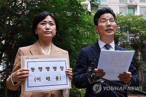 (서울=연합뉴스) 홍해인 기자 = 국회 교육위원회 더불어민주당 백승아 의원과 정을호 의원이 14일 서울 마포구 이배용 전 국가교육위원장의 자택 앞에서 국정감사 증인 불출석과 관련해 동행명령장 집행을 시도하며 취재진을 향해 입장을 밝히고 있다. 2025.10.14