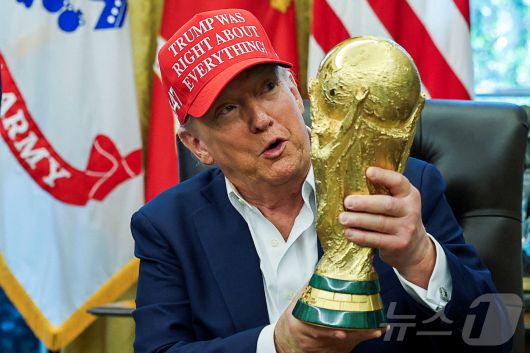 도널드 트럼프 미국 대통령이 8월 22일(현지시간) 워싱턴DC 백악관 집무실에서 '트럼프가 전부 옳았다!'(Trump Was Right About Everything!)라고 적힌 모자를 쓴 채 FIFA 월드컵 트로피를 들고 2026년 FIFA 월드컵 관련 발표를 하고 있다. 2025.08.22. ⓒ 로이터=뉴스1 ⓒ News1 윤다정 기자 |