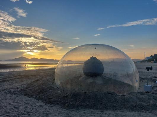 낙동강과 남해가 만나는 부산 서남쪽 끝 다대포의 몰운대 근처에서 이 황홀한 노을 풍경을 본다. 그냥 보는 것이 아니라 투명한 비닐막으로 싼 돔 구체를 통해 바라보는 체험을 하게 된다. 합성수지인 투명 폴리우레탄으로 만든 구체가 부산에서 나는 다시마를 뭉쳐 만든 덩어리를 싸고 있는 기묘한 조형물이다. 이탈리아 작가 마르코 카네바치와 양예나 작가가 합심해 꾸린 작가 듀오 플라스티크 판타스티크가 공들여 만든 ‘폴리미터’란 작품이다. 세월이 흐르면 썩어서 사라질 생명체 다시마와 영원히 썩지 않는 플라스틱 재질의 돔이 뒤얽힌 디스토피아적 작품이지만, 환상적으로 변하는 대자연의 노을빛이 이런 부조화마저 녹여버리는 놀라운 모순을 목도하게 된다.