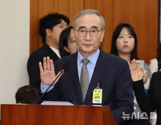 [서울=뉴시스] 배훈식 기자 = 김영섭 KT 대표이사가 14일 오후 서울 여의도 국회에서 열린 정무위원회 국정감사에서 증인 선서를 하고 있다. 2025.10.14. dahora83@newsis.com |