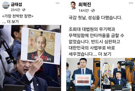 여당에서도 쓴소리가 나왔습니다. 박수현 민주당 수석대변인은 "이런 모습들이 방송이 됨으로써 조 대법원장을 압박하고 망신 주고 했다는 프레임에 갇히지 않겠느냐"며 "본질적인 답변을 이끌어내는 회의에 도움이 되지 않았다"고 비판했습니다. 다만 "최 의원은 민주당에서 제명된 무소속 의원"이라며 민주당과 분명한 선을 그었습니다. 최 의원은 오늘 새벽 SNS에 팻말을 든 자신의 사진을 올리며 "국감 첫날, 성심을 다했다"고 자평했습니다.