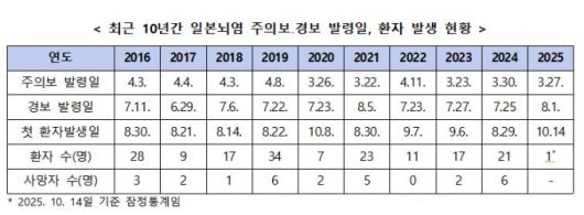질병관리청은 이날 올해 일본뇌염 주의보 발령(3월27일), 경보발령(8월1일) 이후 첫 일본뇌염 환자가 확인됐다고 밝혔다.