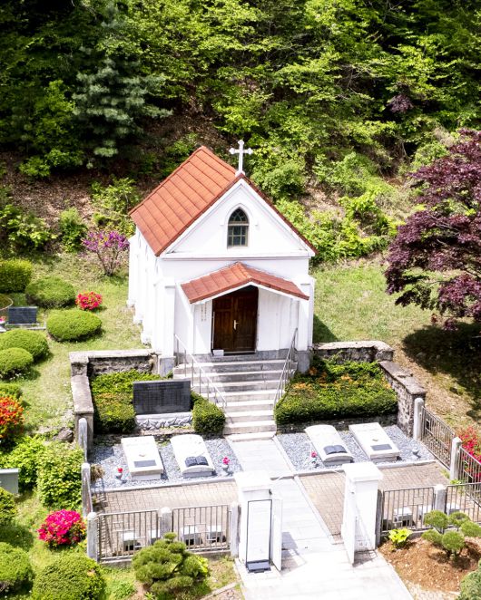 ‘1928년 7월 준공’이란 글자가 입구 기둥에 새겨져 있다. 김대건 신부가 시복(諡福)된 것은 1925년이니, 기념 성당은 시복 3년 후에 지어진 것이다. 100년이 다 된 건물이지만 오래된 느낌은 들지 않는다. 성당 입구엔 돌무덤 4기가 안장돼 있다. 김대건 성인과 조선교구 3대 교구장 페레올 고(高) 주교, 미리내 본당 초대 주임 신부로 33년간 일한 강도영 신부, 3대 주임 최문식 신부다.