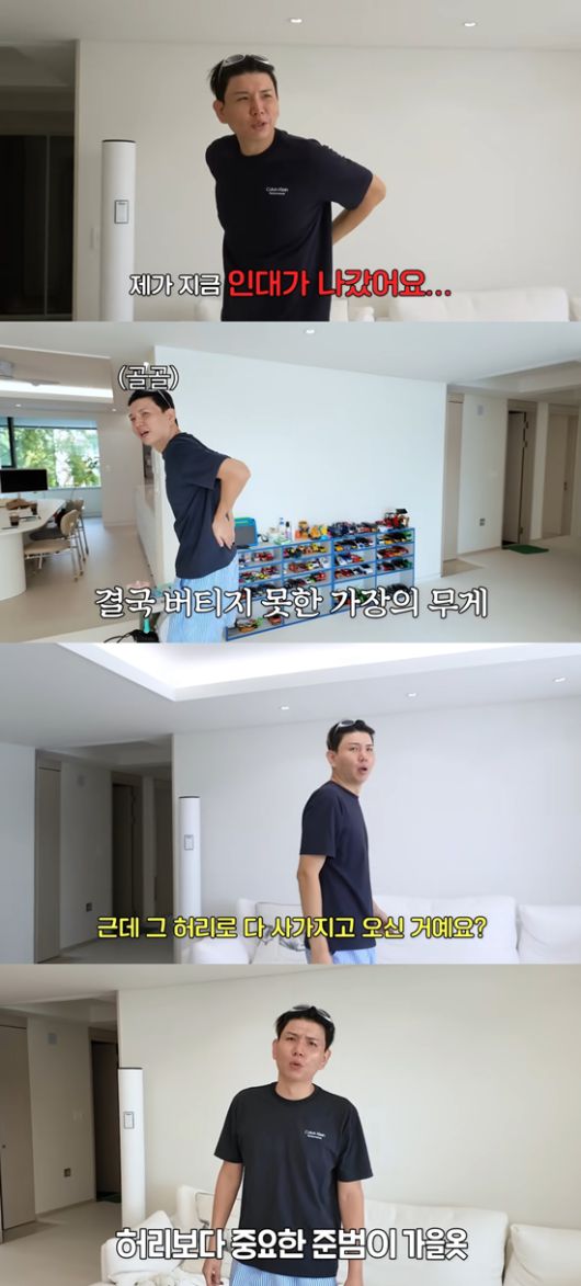 이어 제이쓴은 일어서다 허리를 짚으며 "17kg (아들을) 들고 다녔더니 제가 지금 인대가 나갔다"라며 "나 침 두 방 맞고 왔다"라고 고백했다.