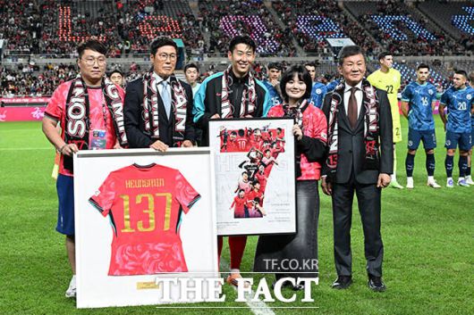 오래된 전설과 현재의 전설이 한 자리에서 같은 유니폼을 들고 기념사진을 촬영한 뒤 KFA 회장 정몽규와 붉은 악마가 손흥민에게 선물을 증정하는 시간이 이어졌다.