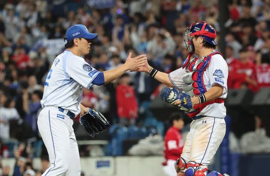 14일 오후 대구 삼성라이온즈파크에서 열린 프로야구 2025 신한 SOL뱅크 KBO 준플레이오프 4차전 SSG 랜더스와 삼성 라이온즈의 경기, 삼성 마무리 김재윤과 포수 강민호가 9회초 경기를 마무리 지은 뒤 환호하고 있다. /뉴스1 |