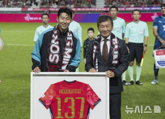 [서울=뉴시스] 김근수 기자 = 한국 남자 선수 A매치 최다 출전한 손흥민이 14일 오후 서울 마포구 서울월드컵경기장에서 열린 하나은행 초청 축구국가대표팀 친선경기 대한민국과 파라과이의 경기 시작 기념 유니폼을 전달받고 정몽규 축구협회장과 기념촬영을 하고 있다.손흥민은 지난 10일 브라질전에 개인 통산 137번째 A매치에 출전했다. 차범근 전 대표팀 감독, 홍명보 대표팀 감독(이상 136경기)을 제치고 한국 남자 축구 역사상 최다 출전 기록 보유자가 됐다. 2010년 12월 시리아전 데뷔 이후 15년 만이다. 2025.10.14. ks@newsis.com |