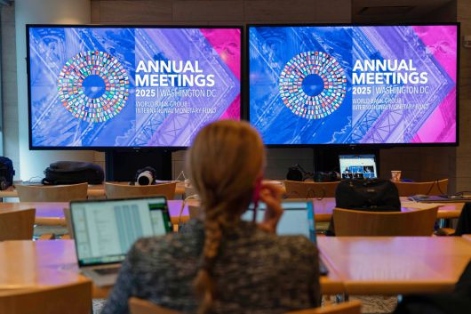 14일(현지시간) 미국 워싱턴의 국제통화기금(IMF) 본부에서 열린 세계은행/IMF 연례 회의 기자실에 모니터 화면이 띄워져있다. AP연합뉴스 |