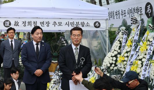 14일 오전 11시 정 씨를 대리하는 박경호 변호사는 김건희 특검 사무실이 있는 서울 종로구 KT광화문빌딩웨스트 빌딩 후문에 차려진 정 씨의 분향소 앞에서 기자회견을 열었다. 박 변호사는 “고인이 심야조사 조서 중 마지막 두 페이지에 문제가 있다고 말했다”며 “(수사관이) 고인이 아닌 다른 사람의 진술을 그대로 따서 ‘예’라는 답변을 미리 적어놓고 닦달했다”고 주장했다.