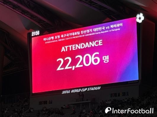 직접 비교는 어려워도 22,206명은 충격적인 수치다. 코로나19로 무관중 혹은 일부 관중만 받던 시절을 제외하면 항상 서울월드컵경기장에서 열리는 경기는 매진 혹은 매진 근사치였다. 정몽규 회장을 향한 비난, 홍명보 감독 부임 사가 등 여러 부정적 이슈에도 관중은 경기장을 찾아줬다. 손흥민-이강인-김민재 스타 파워도 있었다.