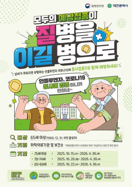 대전시가 65세 어르신 등 고위험군을 대상으로 인플루엔자(독감) 및 코로나19 무료 예방접종을 시작한다.