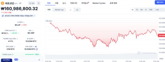 15일 글로벌 가상자산 시황중계 사이트 코인마켓캡에 따르면 오전 9시 기준 비트코인 가격은 24시간 전 대비 2.68% 하락한 1억6098만원을 기록했다. 일주일 전과 비교하면 6.72% 내렸다.